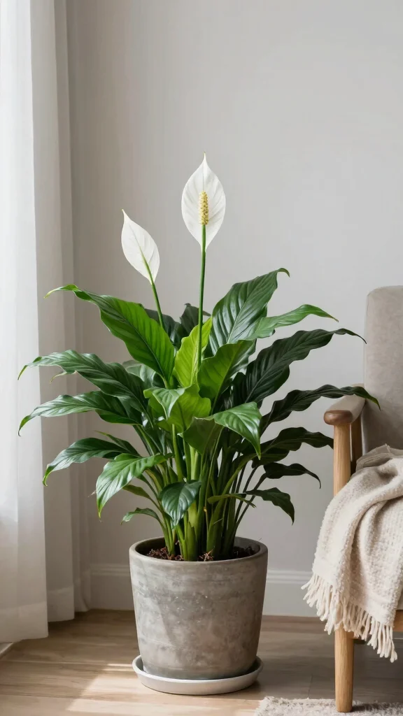 Introduce tranquility to your living room with a peace lily. Known for its elegant white blooms, this plant thrives in low light while enhancing air quality, creating a serene atmosphere. Placing it in a cozy corner can soften the space and add a touch of sophistication to your decor.