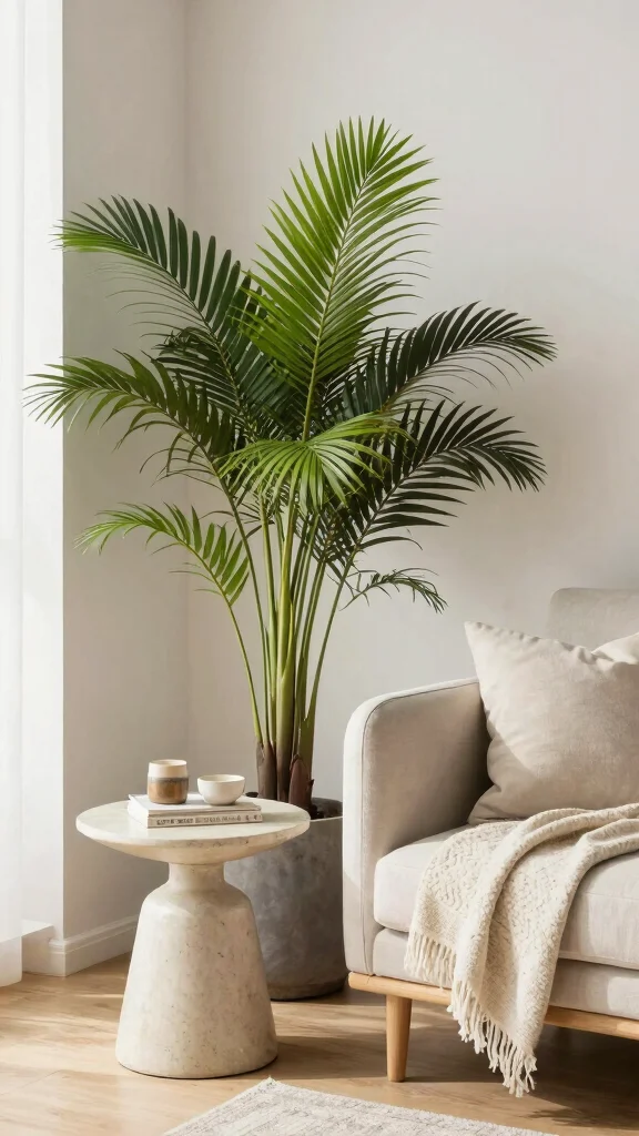 Add a touch of the tropics to your living room with a bamboo palm! Its feathery fronds bring a sense of liveliness, thriving beautifully in low light. Positioning it near your sofa allows it to be both a visual delight and a natural divider between spaces, enhancing the flow of your room.
