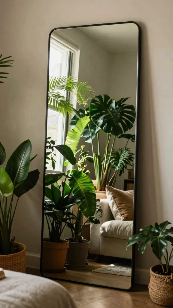 Using mirrors with decorative frames adds character and charm to your decor. This thoughtful placement not only amplifies light but also creates stunning visual effects that highlight your plants.