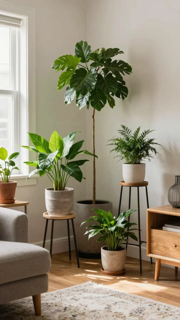 Elevate your indoor plants with stylish plant stands that add height and dimension to your displays! These versatile pieces can create visual interest and depth, making your plants stand out beautifully. Imagine a staggered arrangement where a tall leafy plant sits on a stand next to smaller plants on the floor, creating a dynamic and appealing setup.
