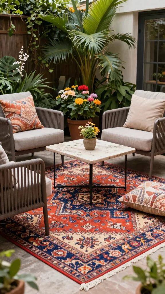 Adding an outdoor rug can instantly elevate your backyard’s overall design. Rugs help define areas, transforming them into inviting outdoor rooms. Available in a variety of colors and patterns, they can match your personal style.