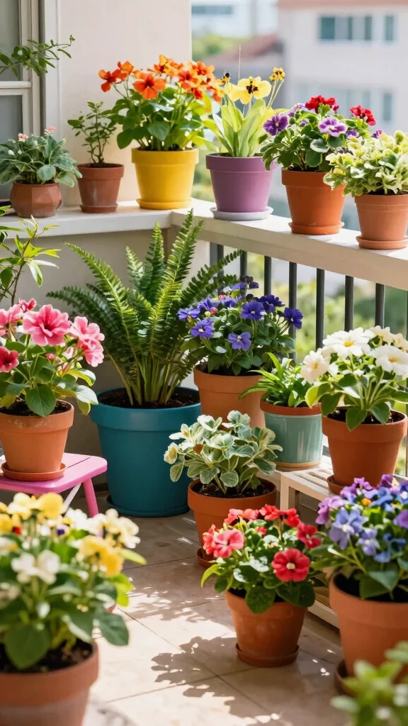 By using colorful pots, your balcony garden bursts with character, creating a joyful and inviting environment.