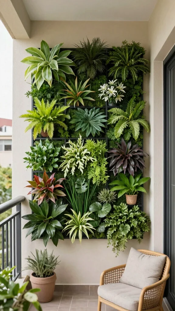 Green wall art elevates vertical gardening by merging aesthetics with creativity. Using a blend of plants and wall-mounted structures, you can craft a stunning living display that serves as a focal point on your balcony. This imaginative approach brings together beauty and nature in an eye-catching way.
