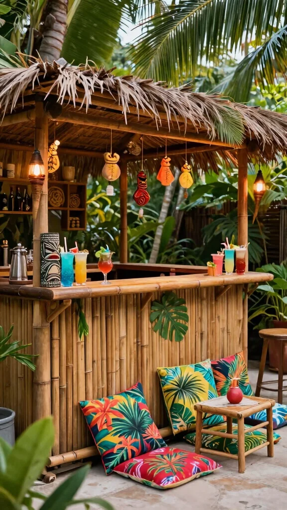 Tiki Bar SetupBamboo, reclaimed woodServe fruity cocktails, use decor