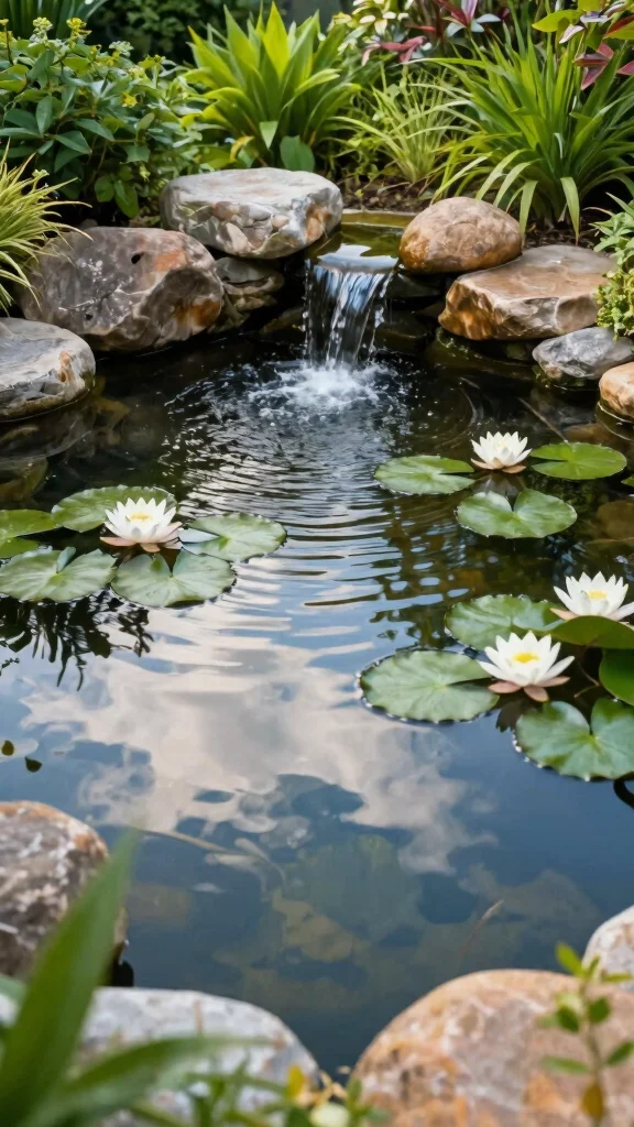 Tranquil Water FeatureNatural stones, aquatic plantsAdd fish and lily pads