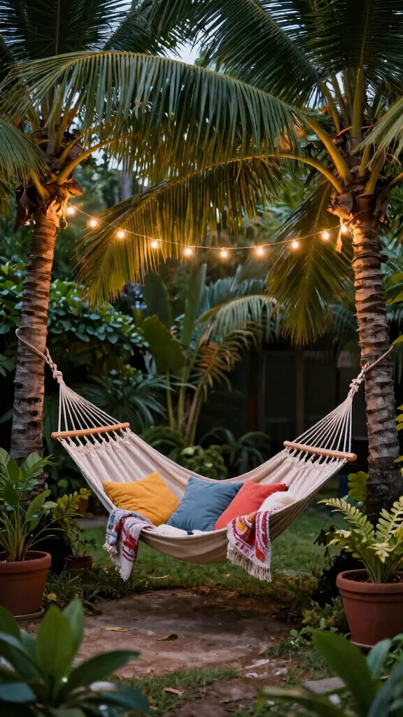 Imagine a shady corner of your backyard where a cozy hammock awaits. Hang it between two palm trees or use a stand if you lack trees. Picture yourself swinging gently with a refreshing drink, surrounded by the sounds of nature.