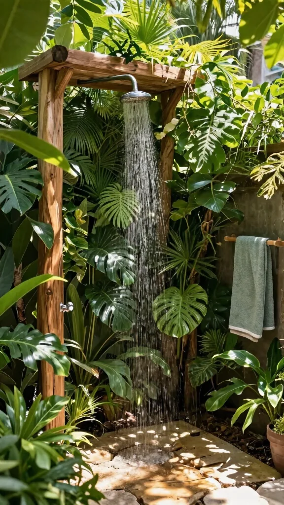 Bring a slice of beach life home by installing an outdoor shower. This addition combines practicality with luxury, making your backyard feel like a resort. Choose a wooden frame with natural finishes or bamboo for an authentic tropical vibe.