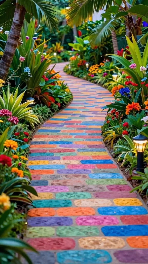 To frame this pathway, incorporate tropical plants along the sides, adding surprise and delight. Consider placing solar-powered lights along the edges to illuminate the path at night.