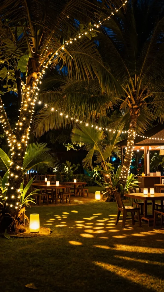 For a magical effect, drape string lights through palm fronds or wrap them around trees. Use lanterns on tables or hanging from hooks to cast soft, flickering shadows.
