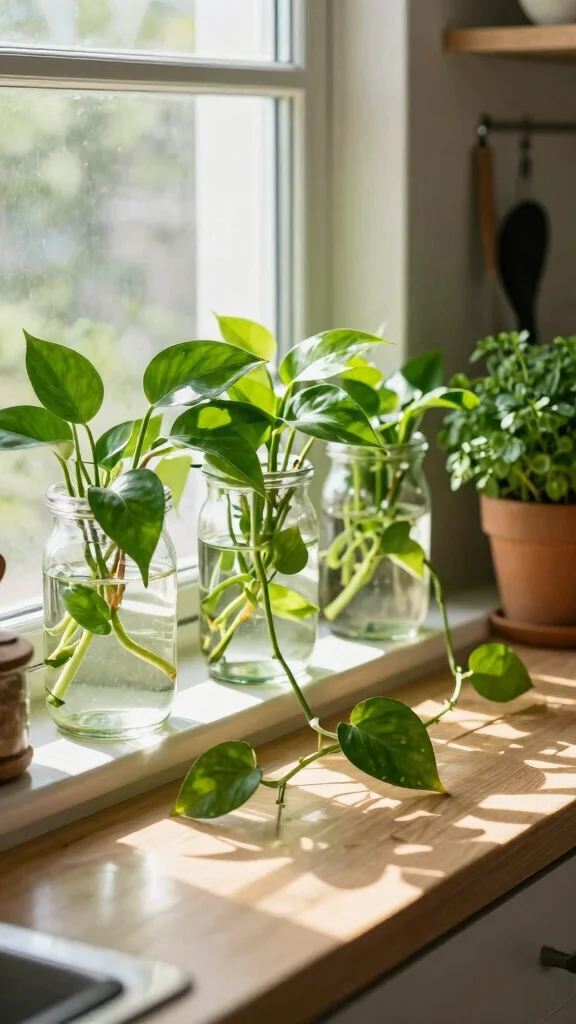 Water plants indoor? Pothos in water keeps it simple. Drop cuttings into a clear container, submerge the nodes, and refresh the water every week—watch those trailing vines brighten even dim corners.
